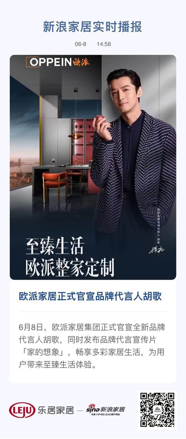 6月8日,欧派家居集团正式官宣全新品牌代言人胡歌,同时发布品牌代言宣传片「家的想象」,畅享多彩家居生活,为用户带来至臻生活体验。