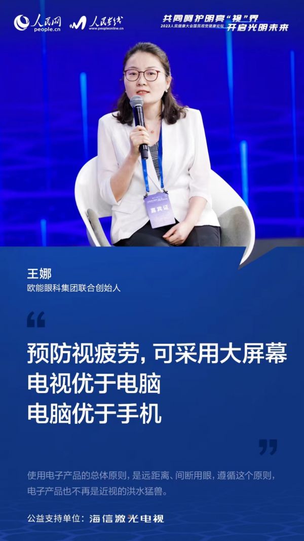专家们还对青少年使用电子产品给出了具体建议。欧能眼科集团联合创始人、重庆市妇幼卫生学会儿童心理行为与发展专委会视觉行为发育学组副组长王娜提到,使用电子产品的总体原则,是远距离、间断用眼,遵循这个原则,电子产品也不再是近视的洪水猛兽。她建议道,“预防视疲劳,可采用大屏幕。电视优于电脑,电脑优于手机”。