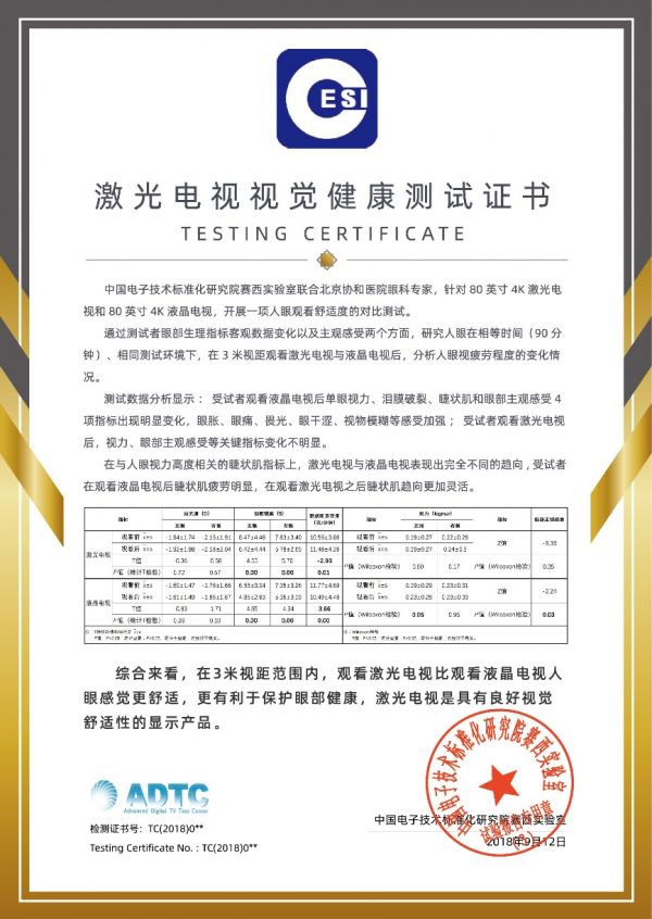 国家直属权威检测机构中国电子技术标准化研究院赛西实验室和北京协和医院眼科专家,通过人群相同条件下观看激光电视和液晶电视的严格对比试验,测试数据分析显示:受试者观看液晶电视后单眼视力、泪膜破裂、睫状肌和眼部主观感受4项指标出现明显变化,眼胀、眼痛、畏光、眼干涩、视物模糊等感受加强;受试者观看激光电视后,视力、眼部主观感受等关键指标变化不明显。研究发现:在3米视距范围内,观看激光电视比观看液晶电视人眼感觉更舒适,更有利于保护眼部健康,激光电视是具有良好视觉舒适性的显示产品。