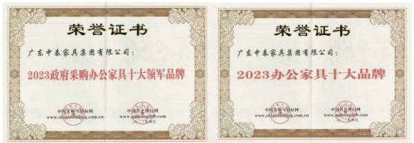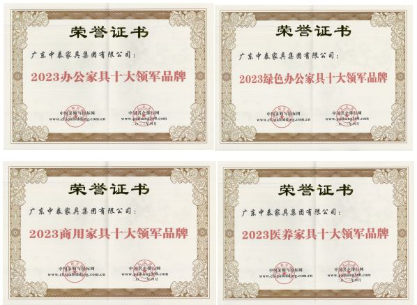 在由中国采购与招标网、中国名企排行网共同主办的“2023第十三届家具招标采购评价推介”活动中,广东中泰家具集团有限公司凭借自身过硬的实力、突出的业绩及在业内的良好声誉,获得“2023绿色办公家具十大领军品牌”“2023绿色办公家具十大品牌”“2023办公家具十大领军品牌”“2023办公家具十大品牌”“2023政府采购办公家具十大领军品牌”“2023政府采购办公家具十大品牌”“2023商用家具十大领军品牌”“2023商用家具十大品牌”“2023医养家具十大领军品牌”“2023绿色医养家具十大品牌”。