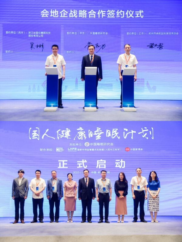 会上,中国睡眠研究会、余杭区科协和浙江丝里伯睡眠科技股份有限公司签署了会地企战略合作协议。由中国睡眠研究会、新华网等发起的“国人健康睡眠计划”值此大会之际同步启动。