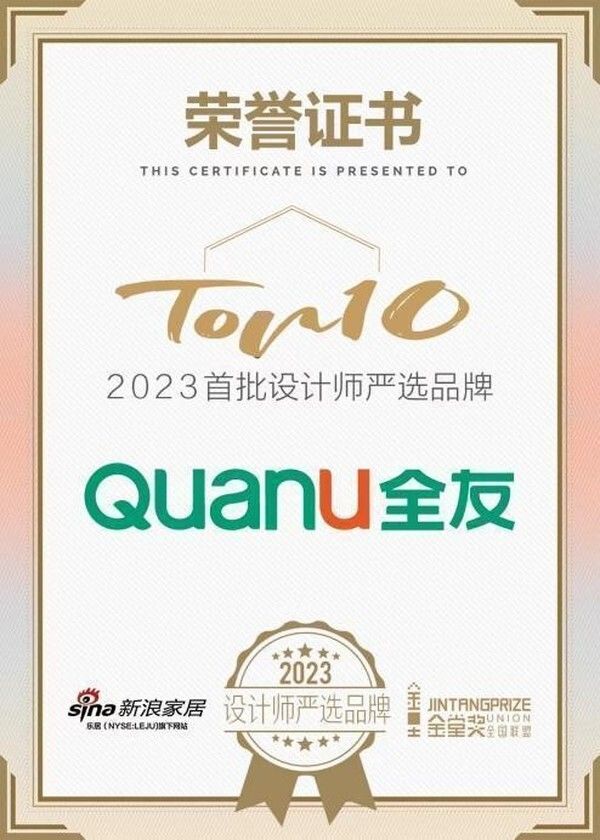 近日,由新浪家居联合金堂奖全国联盟共同发起的「2023 设计师严选品牌TOP10」活动重磅启动,活动汇集了全国两岸三地数十位设计大咖担纲特邀点评嘉宾,并邀请全国千余名卓越青年设计师担任推荐官,将以设计师专业视角,甄选出服务于设计师及业主的高品质制造品牌。全友家居荣膺「2023 首批设计师严选品牌TOP 10」称号。