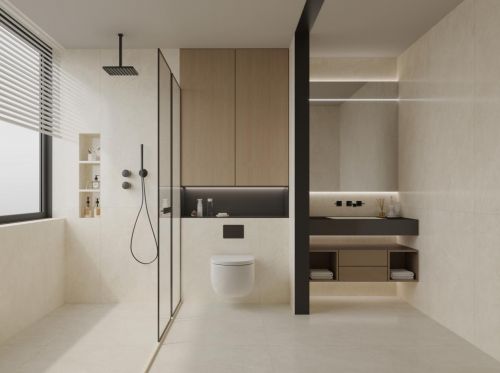 当你走进凯恩石.流光黄打造的卫浴空间,首先感受到的便是宁静与平和,体会到放松和舒适的情绪。空间一角摆放着黑色洗手台,简洁线条和光滑表面展现出现代感和精致的设计。光线在空间中起到了至关重要的角色,它们在低饱和色调的墙面、地面上投下柔和的光晕,让整个空间显得更加宁静和精致。