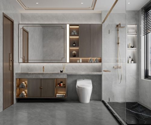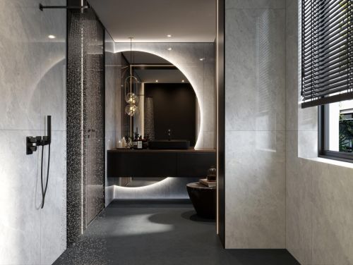 墙面空间中,雅克德罗浅灰的色调给人一种柔和温馨之感,带有中式元素的镜面为空间增添一份古典和艺术氛围;地面采用雅克德罗深灰铺贴,营造出厚重与精致感。这个简美岩板.雅克德罗浅灰和雅克德罗深灰打造的新中式风格卫浴间,展现出了传统与现代的完美结合,以典雅、温馨的氛围,让人在舒适的环境中享受沐浴的乐趣,体验中式文化的独特魅力。