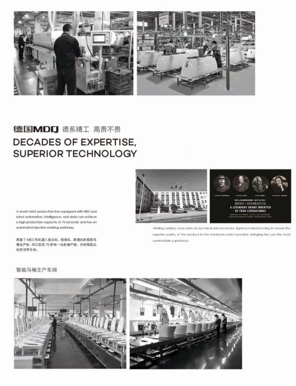150年的品牌故事MDQ,智能设计改变生活方式,在全球顶端智慧工厂品牌中,有着德国独有的精工品质德匠精神,MDQ正式进入中国市场33年,先后荣获德国IF设计奖,荣获AAA企业荣誉认证,荣获智能科技十大品牌,荣获江苏省爱心企业称号,主要研发智慧卫浴,智慧浴室柜,智慧马桶,智慧花洒,智能晾衣架,智能锁,智慧床垫研发生产销售于一体从极致的创意设计精致的品质入口出发,不断丰富“智慧”行业国内发展。MDQ(麦德琪)创始于德国柏林地区,是经过四代人的磨练技术创业和发展,成为德国最具影响力优秀企业百年品牌文化。MDQ四代百年卫浴传承