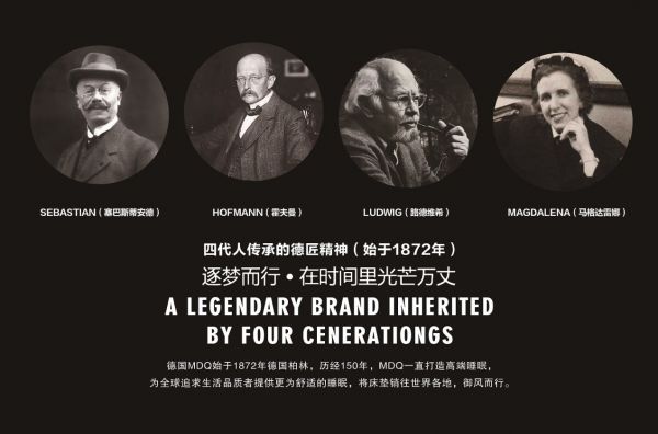 德国MDQ全球国际卫浴,始创于1872年德国,由出生Sebastian(塞巴斯蒂安德)创立,历经赛巴斯家族四代传承。Sebastian出生,也是麦德琪MDQ公司创立元年,不久便继承父业,并与家族的第二代继承人,即他的两个儿子Hofmann霍夫曼,Ludwig路德维希。共同管理公司。2000年,“Hofmann”公司将目光投向中国,尊贵讲究“德国血统”,散发着浓厚的西欧人文气息。MDQ体现后现代主义风格,以自然简约的产品造型,沿袭西欧贵族的奢华气质,并融合现代摩登的感性魅力,成为MDQ产品的美学优良基础。赛巴斯四代传承Mattress Bedding MDQfurniture150founded in 1872 in Germany by Sebastian (Sebastian)