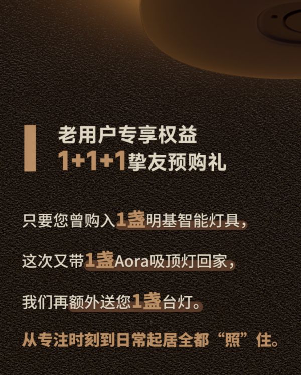 用户的诉求与信赖是明基智能照明创新的不竭动力,每一个用户都是Aora的共创者。在Aora智能吸顶灯上市之际,为感谢老用户长期以来的支持,明基智能照明将这套“1+1+1”专属照明方案作为礼物回馈给广大挚友。