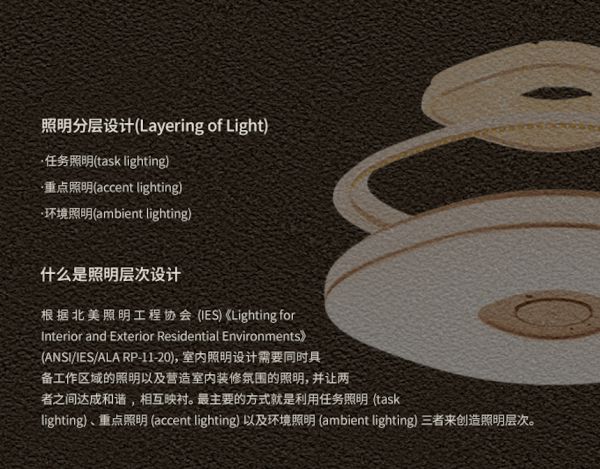 从人因照明角度来看,有层次的照明有助于调节身心,理想的家居照明是充足的环境光与聚焦的任务照明相结合。