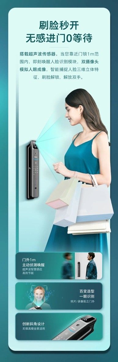 不用带钥匙、不用带手机、不用按密码……刷脸就能享受方便、便捷、安全的入户体验,对于现代家庭来说这已然不是新鲜事,飞利浦智能锁DDL708-FVP特别的地方在于:通过采用双摄像头模拟人眼成像,DDL708-FVP能够智能捕捉人脸三维立体特征,且可有效辨别图片和影像,识别特别准;通过搭载超声波传感器,只要用户靠近门锁1米范围内,人脸识别模块就将被唤醒进入工作状态,识别特别快。