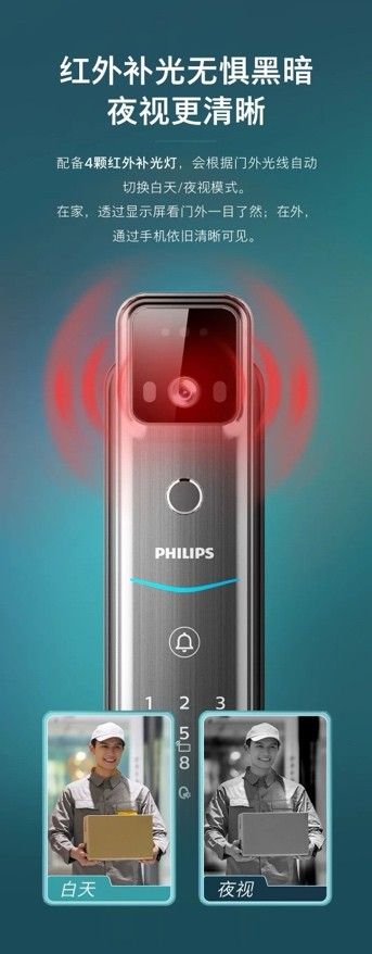 更快更准的刷脸解锁方式、智能可视猫眼在线看家、Wi-Fi联网远程看家等功能带来的非凡智能体验,已经足以让飞利浦智能锁DDL708-FVP从赛道内脱颖而出。在此基础上,飞利浦还十分注重从细节入手提升、优化产品配置,给予用户更好的体验。如为室内面板设置了4英寸LCD显示屏,让用户无需开门即可轻松查看门外景象;配备4颗可根据门外光线自动切换模式的红外补光灯,让用户无论白天、夜晚都能对门外情况一目了然。