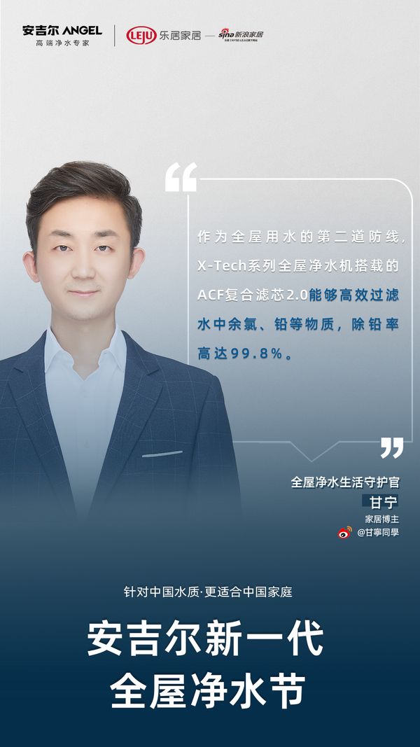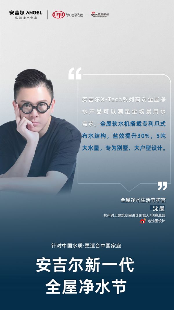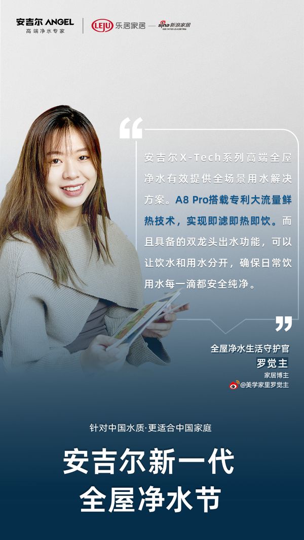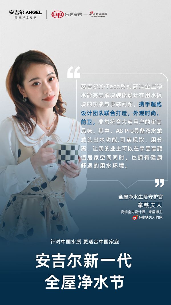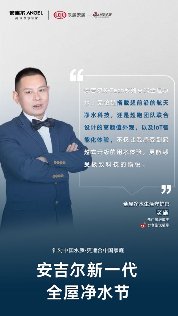 “安吉尔X-Tech系列高端全屋净水,无论是搭载超前沿的航天净水科技,还是超跑团队联合设计的高颜值外观,以及IoT智能化体验,不仅让我感受到跨越式升级的用水体验,更能感受极致科技的愉悦。”