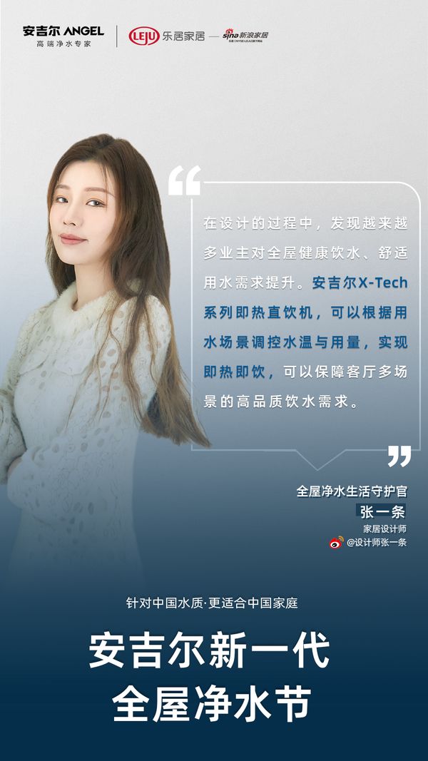 “在设计的过程中,发现越来越多业主对全屋健康饮水、舒适用水需求提升。安吉尔X-Tech系列即热直饮机,可以根据用水场景调控水温与用量,实现即热即饮,可以保障客厅多场景的高品质饮水需求。”