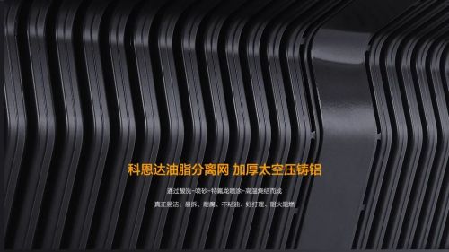 科恩免清洗烟机独创科恩达油脂分离网,采用易洁太空压铸铝材,进过酸洗-喷砂工艺加之特氟龙喷涂最后高温烧结,不仅不沾油、易清洁更好打理。在分离油烟的同时,还能阻燃阻热!保障厨房安全!