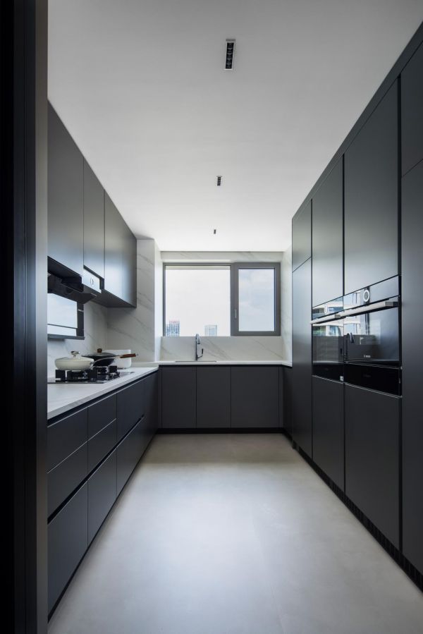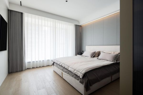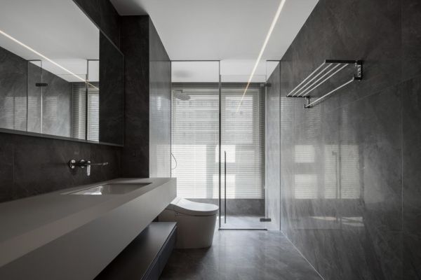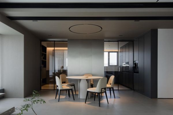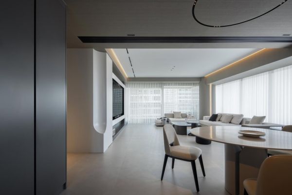 潘成杰:在《37°C灰》的项目中,我们设想家是一本打开的书,从一个人的住所便可以窥见一个人对待生活的态度。身处都市繁华之中,业主更渴望简单与自由。而简单不是去盲从大流,设计师用最i舒适的单品塑造出个性明晰的理想居所,赋予空间无限的温度与意义,而37°C是人的一个最i舒适的体温。空间整体收放有序, 开放式的活动区包括客餐厅,书房与厨房仅设置一道推拉玻璃门,隔而未隔给予空间视觉上的扩大。空间框架简单,配色以灰白黑色系呈现,让人感觉到一种贴近大地自然的舒适感,深色异形茶几、浅色餐桌、素雅布艺、浅色沙发,表达出干练简洁的空间语言。大面积的留白,通过木饰面为空间增加了生活温度。圆润的凹面几何转角契合空间整体气质,与块面分明的电视柜形成对比,尖锐与柔和的线条交错排列,呈现出和谐的空间语言。