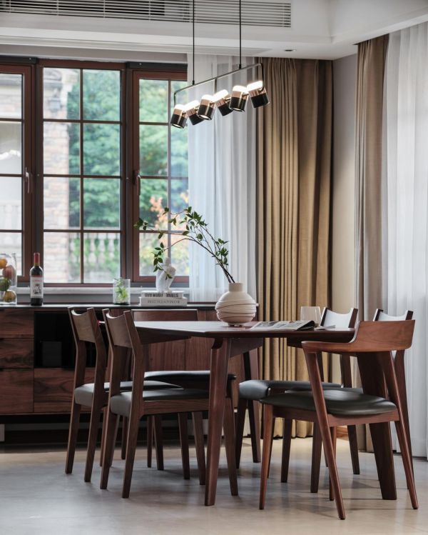 深沉的木色是岁月的沉淀,让新家自带熟悉而温暖的回忆。白纱搭配木质窗棂,复古感十足。时光倏忽后退,带人回到慢节奏的过去。老树长新芽,餐桌上却依旧是往日熟悉的味道,岁月依旧静好。