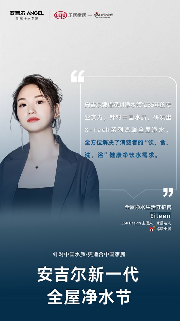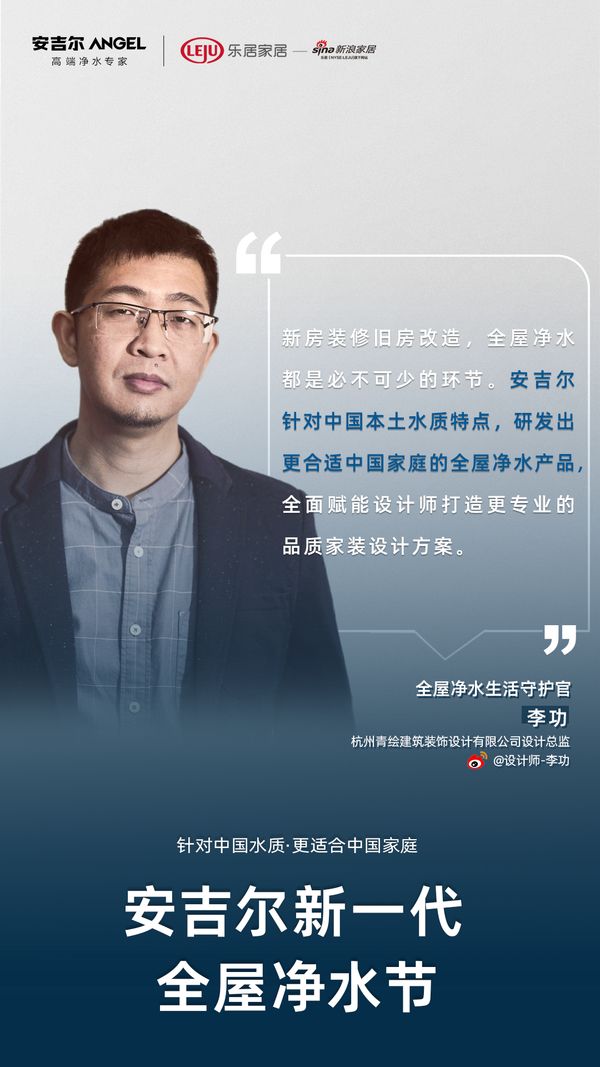 “新房装修旧房改造,全屋净水都是必不可少的环节。安吉尔针对中国本土水质特点,研发出更合适中国家庭的全屋净水产品,全面赋能设计师打造更专业的品质家装设计方案。”