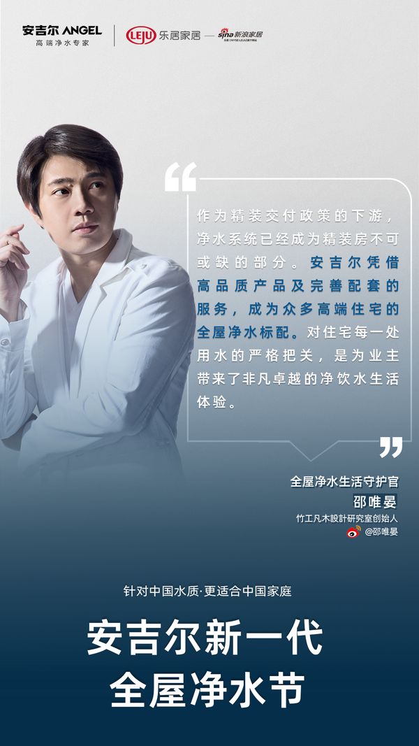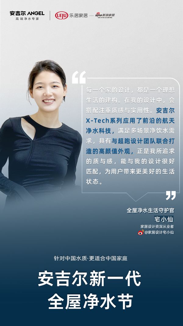 “每一个家的设计,都是一个理想生活的建构。在我的设计中,会搭配注重质感与实用性。安吉尔X-Tech系列应用了前沿的航天净水科技,满足多场景净饮水需求,具有与超跑设计团队联合打造的高颜值外观,正是我所追求的质与感,能与我的设计很好匹配,为用户带来更美好的生活状态。”
