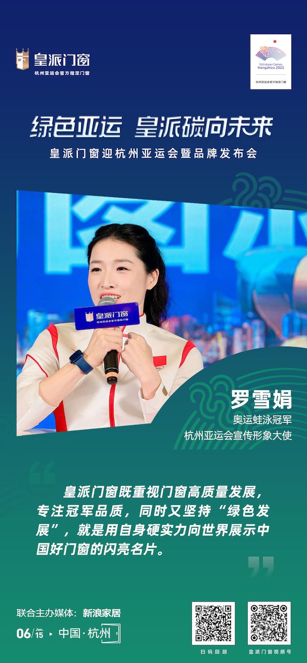 论坛现场,奥运蛙泳冠军、杭州亚运会宣传形象大使罗雪娟表示,皇派门窗既重视门窗高质量发展,专注冠军品质,同时又坚持“绿色发展”,就是用自身硬实力向世界展示中国好门窗的闪亮名片。