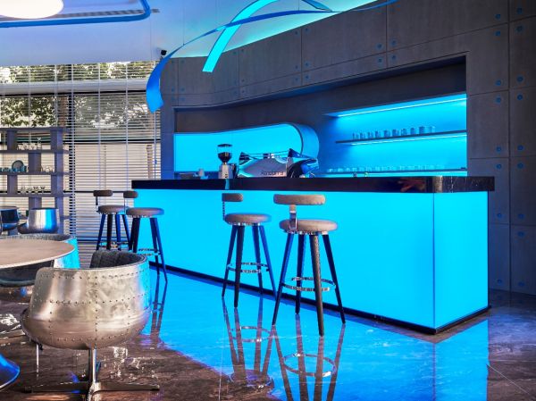 而美克给所有倾听的人营造了一个舒适且富有艺术性的交流环境。在踏进下午茶区域的那一刻,扑面而来的是充满科幻感的太空蓝,强烈的美学张力让人不由自主地被吸引其中,再加上延伸到屋顶的装饰水管、液态金属迷幻灯光,置身其中,来一杯拿铁,或发呆、或拍照,都不失为一个不错的选择。