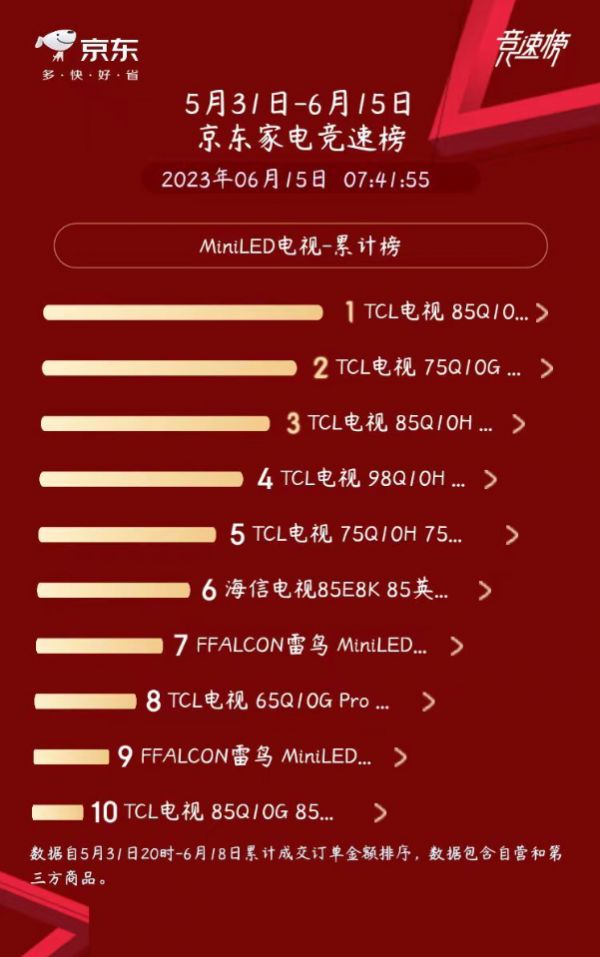 不得不说,作为Mini LED技术领导者,TCL在终端产品的打磨上确实具有自己独特的优势。值得一提的是,Q10H电视目前也是高居618 Mini LED电视销量榜TOP 3,而整个TOP 10榜单中TCL一家就占据了9款,这大概就是硬实力吧!现在已经下单了,就等着送货上门了!