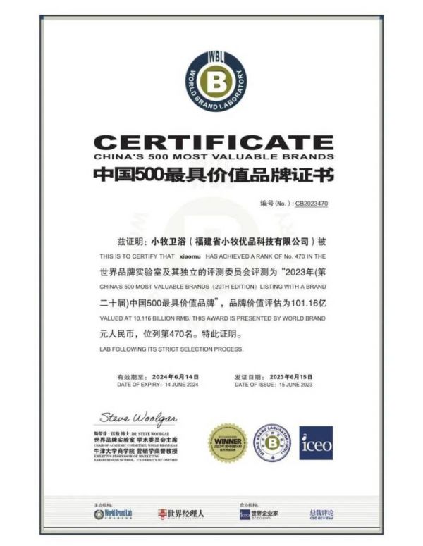 6月15日,由世界品牌实验室(WBL)主办的2023年第二十届世界品牌大会在北京隆重举行,大会发布2023“中国500最具价值品牌”榜单。小牧卫浴今年以101.16亿品牌价值再次入围,较去年品牌价值增长近30亿。