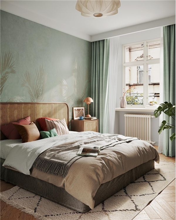卧室背景墙采用绯金·映叶搭配,平静而内敛的繁叶在细腻背景下交织,就像被光投射在卧室的画布上。整个卧室弥漫着独特而迷人的氛围,有着与众不同的美感。绯金·映叶墙砖的设计还能够为卧室增添一份自然和生机,繁叶的图案与绿色窗帘相映衬,给人一种连接大自然的感觉。在卧室中引入这样的自然元素,可以让我们感受到大自然的活力和平衡,从而提升整个空间的生气和活力。