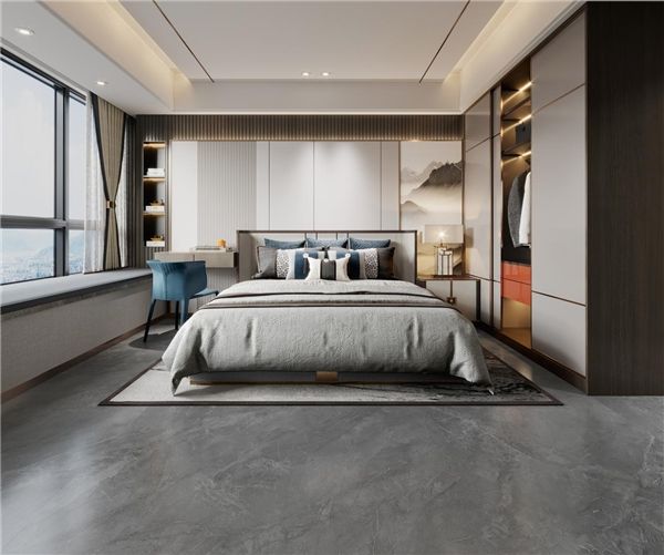 中灰色简美岩板为整个空间带来了一种稳重和平衡感,与蓝色靠枕、蓝色座椅和灰色床品形成了一种和谐的色彩搭配,蓝色靠枕和座椅为空间增添了一抹清新和宁静的氛围,同时也呼应了传统中式的色彩偏好。墙上山水墨画更是展现了传统中式绘画的韵味和文化底蕴,黑白色调与整个空间的色彩相协调,为空间增添了一份艺术和品味。兴辉瓷砖简美岩板.布雷拉中灰塑造的新中式风格卧室空间融合了传统中式元素和现代设计风格,给人一种古典与现代的结合感,独特、舒适又具有个性,适合追求中式文化和现代舒适的人们。
