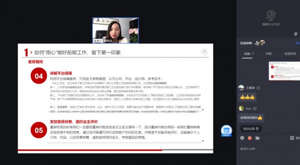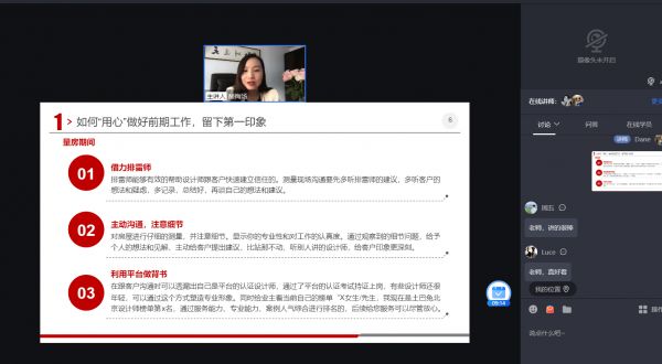 王小燕的分享贯穿了设计师与业主沟通的各个阶段,包括如何做好量房前的准备工作,设计师如何利用排雷师在量房现场建立业主信任、利用量房问卷加深印象,量房后针对不同客户类型制定沟通策略,既能体现设计师专业度又能精准掌握客户需求,给客户提供多样化的设计方案。“首先,一定要深入了解客户,与客户充分沟通,了解客户的喜好、风格、需求和预算情况。其次,土巴兔平台为设计师签约提供了很多天然的保障服务,比如:先装修后支付、第三方质检和陪签。一定要学会利用平台保障服务,打消业主顾虑。最后,也是非常重要的一点,团队合作和及时反馈。学会从不同的角度思考和设计,才能够保证方案的多样性。”