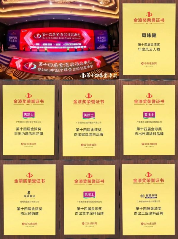 更让人感到惊喜的是,在第十四届金漆奖颁奖典礼暨2023中国涂料企业经销商峰会上,美涂士董事长周炜健获第十四届金漆奖年度风云人物。美涂士产品分别获第十四届“金漆奖杰出艺术涂料品牌”、“金漆奖杰出内墙涂料品牌”、“金漆奖杰出外墙涂料品牌”、“金漆奖杰出家具涂料品牌”。此外,湖南海谊建材作为美涂士优秀经销商获评“金漆奖杰出经销商奖”,美涂士集团兄弟公司江苏金陵特种涂料获“金漆奖杰出工业涂料品牌”,使美涂士品牌在消费者中享有盛誉,被视为高品质建筑涂料的倡导者,在专业用户和消费者中形成“专业可靠、值得信赖”的口碑。