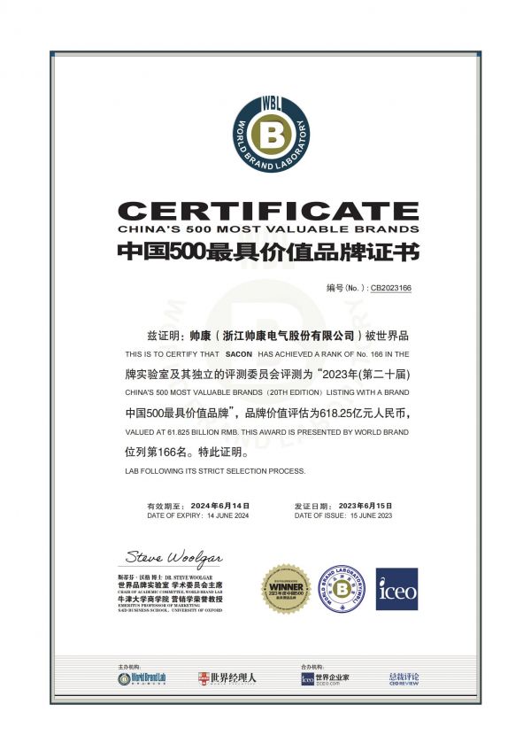 2023年6月15日,由世界品牌实验室和世界经理人联合主办的第二十届世界品牌大会在北京隆重举行,会上发布了2023 年度 (第 20 届)“中国 500 最具价值品牌”榜单。作为中国1第一代厨电头部品牌,帅康以618.25亿元的品牌价值连续16年强势入选榜单,位列榜单166位,在专业厨电品牌中位居前列,品牌领跑地位得到行业内外的广泛认可。