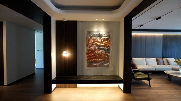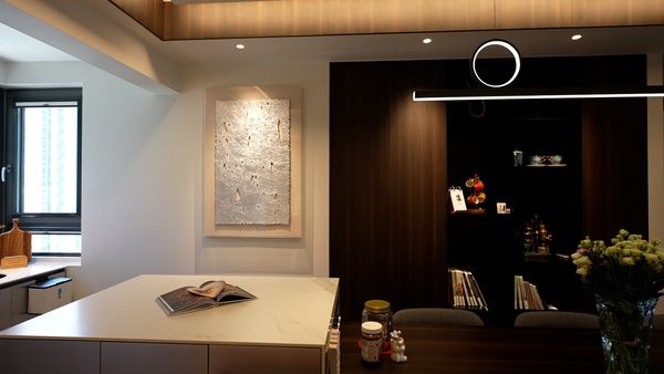不只是茶室的这一切,就连客厅通向餐厅过道,以及摆在餐厅的这两幅挂画,都是蓝谷从广州等地经过多番寻觅才找到能契合王敏审美高度的装饰。这个家的一切布置都精准地落在了王敏一家人对理想家的设想上,而装修完成不久后的入住体验感更是获得了王敏一家的高度认可——整个家闻不出一丝异味,就连王敏也禁不住私下测了房子的各种排放数据,测试结果皆完美达标。对于家有孩子而且经历过疫情冲击的家庭而言,这就是最令人放心的家。