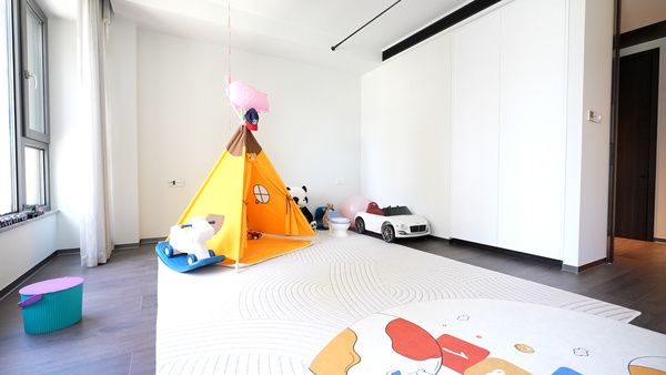为了能最大程度地提高空间利用率,也为了有更好的居住体验,按照王敏的想法,他把原来四间卧室中的三件改成了儿童活动室、茶室等贴合一家三口需求的活动空间。特别是他那尤其钟爱的茶室更是花了大功夫进行设计打造——其与客厅以电视柜大致隔开,大面积的玻璃窗从客厅一直延伸至茶室,使一体化的空间显得宽敞大气而不失私密性。