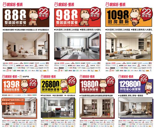 靓家居22年专注整装套餐,是国内率先提出“按平米计价”整装套餐的家装品牌,作为整装开创者,持续为广大业主推出不同类别的“标准化+个性化”的整装套餐,既有经典版888元/㎡新房装修套餐、也有针对房屋老龄化的1098元/㎡旧房翻新套餐,再细分消费者装修需求,推出26800元(5㎡)厨房翻新、19800元(20㎡)整装定制、129800元(100㎡)拎包省心装等套餐,更有1398元/㎡大牌联名整装套餐,惠享大牌产品套餐!周年庆22款整装套餐,总有一款满足你的装修需求。