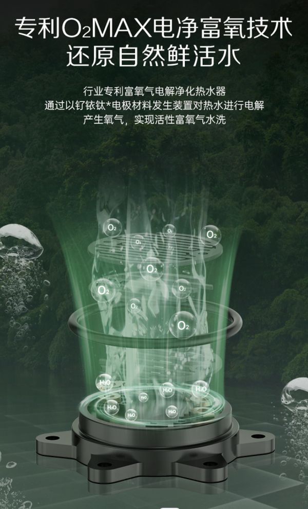 再以万家乐富氧浴燃气热水器森氧Q5L为例,通过专利O2MAX电净富氧技术,对热水进行电解产生氧气,实现活性富氧气水洗,让用户得以感受森氧沁润肌肤的通透自然。