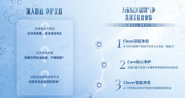 万家乐超微气泡水燃气热水器蓝湖Q8,通过M-Nano超微气泡水技术+五重抗菌,可实现深层净润、贴心净护、智能净洗等三重功效。