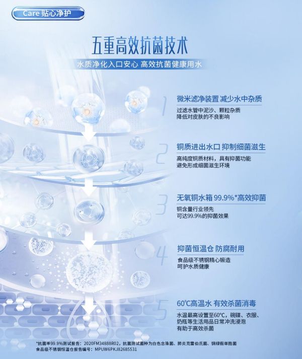 万家乐所推出的蓝湖Q8,具备“五重高效抗菌技术”,可以高效抗菌,贴心净护:一重微米滤净装置,过滤大颗粒杂质;二重铜质进出水口,不易积垢抗氧化,保障水质洁净;三重无氧铜水箱,99.9%高效抑菌;四重食品级不锈钢抑菌恒温仓,防腐耐用;五重可调节水温,最高可到60℃,配合多重技术,实现对碗碟、奶瓶等极易滋生细菌的生活用品杀菌消毒。