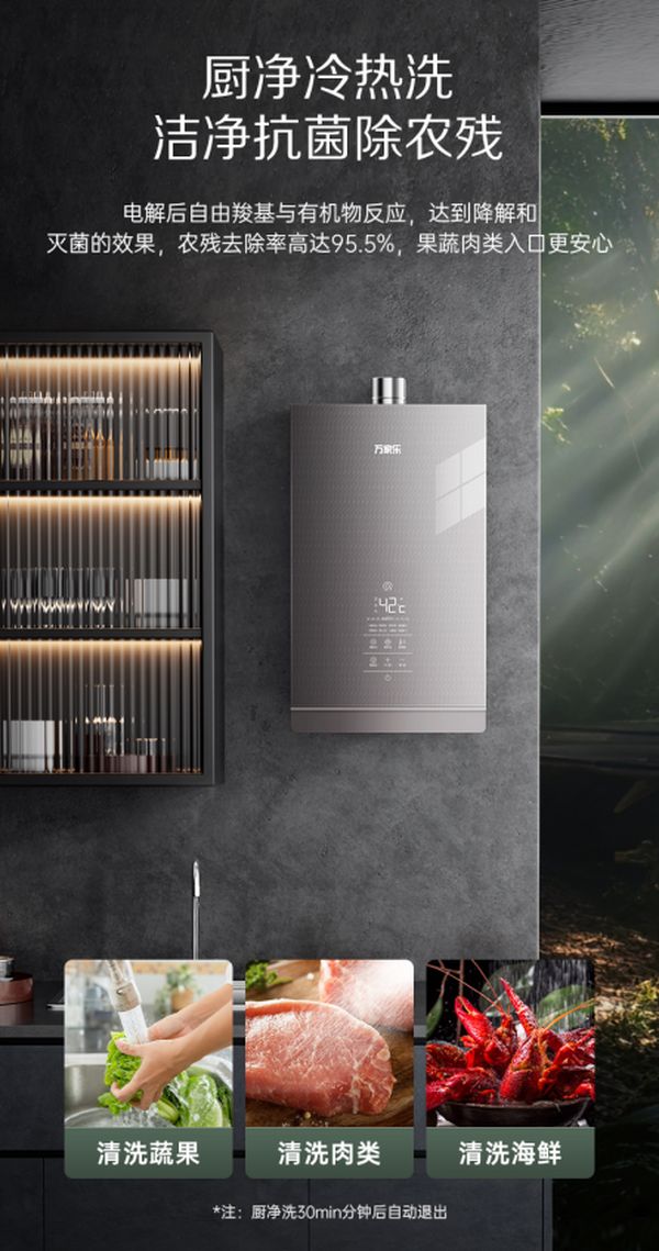 此外,万家乐Q5L燃气热水器的“厨净冷热洗”模式,将使用场景扩充到餐前,利用电解造氧方式改善水质,微生物和农残去除率有效提升至95.5%,让果蔬肉类海鲜等食材入口更安心。