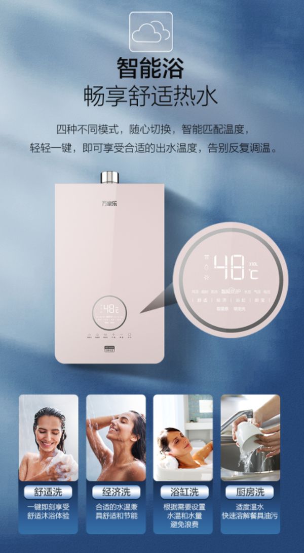 比如适合孩子体温感受的39°儿童浴,适合父母年长人群的42°老人浴,适合泡澡人群的浴缸浴,以及适合全家人的41°舒适浴等,在针对不同人群使用习惯下,照顾了他们的不同“洗”好。贴心关怀下,万家乐“个性智能浴”功能让健康水实现了量身定制专属沐浴。