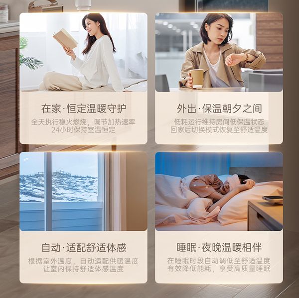 ③第三代 ECO节能技术,为用户提供了4重节能采暖模式,根据用户的不同需求切换不同模式。比如在家模式可以开启24小时温暖陪伴用户,保持室内恒温状态,在外模式就可以开启低保温低耗能状态,让用户回家后不用等待变暖,更节能;睡眠模式可以让温度更适宜睡眠,同时降低能耗;自动模式则是自动根据室外温度自主调节室内温度。适应不同场景的采暖需求,匹配不同的燃烧功率,以更高效率实现更低能耗,万家乐冷凝壁挂炉B6L将“绿色节能”贯彻到底。