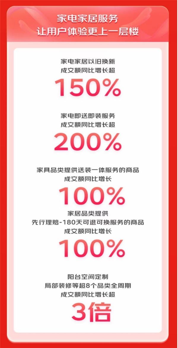 优质服务的加持,为广大品牌、商家注入增长新动能,进一步拉动销售增长。京东618期间,家电家居提供以旧换新服务商品的成交额同比增长超150%,家具品类提供送装一体服务商品的成交额同比提升100%;家居品类先行理赔服务保障超2500万订单,商品成交额同比提升100%;阳台空间定制、局部装修全周期成交额同比增长超3倍;通过京东设计家平台VR样板间功能引入成交额全周期环比增长超5倍。