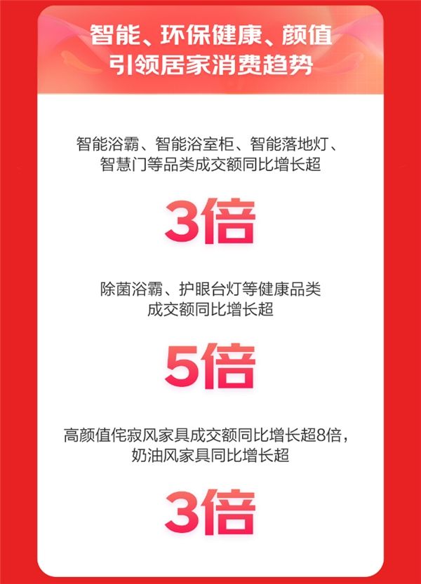 京东618消费数据显示,智能、健康、颜值成为美好家居生活的关键词,应对高温季的清凉宅家需求,以及端午节、父亲节等节日礼赠需求也带动相关品类热销。京东618期间,智能浴霸、智能浴室柜、智能落地灯、智慧门等品类成交额同比增长超3倍;除菌浴霸、护眼台灯等品类成交额同比增长超 5倍;侘寂风家具成交额同比增长超8倍,奶油风家具同比增长超3倍。京东618高潮期前10分钟,凉感夏被、冰格模具成交额同比增长超10倍;营造过节仪式感的端午香囊、五彩手绳等节庆品类成交额同比增长超20倍。