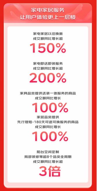 优质服务的加持,为广大品牌、商家注入增长新动能,进一步拉动销售增长。京东618期间,家电家居提供以旧换新服务商品的成交额同比增长超150%,家具品类提供送装一体服务商品的成交额同比提升100%;家居品类先行理赔服务保障超2500万订单,商品成交额同比提升100%;阳台空间定制、局部装修全周期成交额同比增长超3倍;通过京东设计家平台VR样板间功能引入成交额全周期环比增长超5倍。