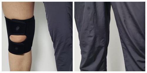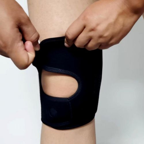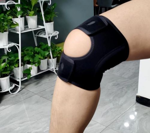 髌骨的位置设计了开孔,孔洞一圈做了加厚处理,可以在一定程度上减少护膝对髌骨的压力,同时更好地固定髌骨,避免髌骨异常移动而产生摩擦疼痛。