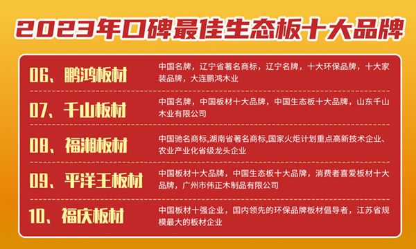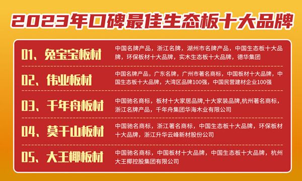2023年2月15日,木业网金匠榜主办了“2023年口碑最佳生态板十大品牌”网络评选活动。纵观板材行业,“口碑最佳”成为了一年一度必争的荣誉高地。主办方以公开、客观作为评选原则,对整个板材行业进行全面梳理,通过调查品牌的咨询服务、购买服务、配送服务、售后服务等进行综合分析,以遴选出行业中真正服务优质品牌,引导行业健康稳定发展。通过为期两个多月分析和评选,十大品牌榜单终于重磅出炉!以下是本次名单的详细排名: