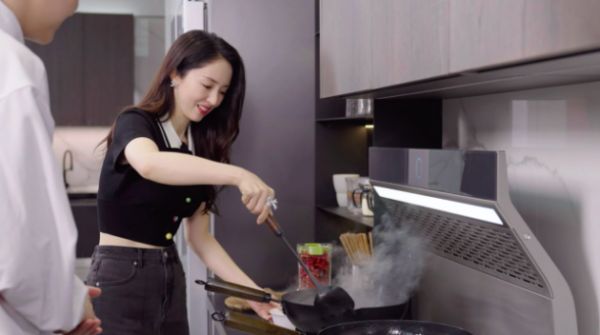 在测试之前,董璇就直言,以往的厨房都是封闭式的,炒菜的时候油烟特别大,一般都不敢开门,所以她在厨电产品选择上,非常看重油烟的吸收能力。