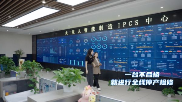 专门用于自动抓取、自动放置的大型智能机械手,可以达到5倍生产能效,几秒钟就能生产出一台产品,一分钟可以生产出几十台;而到了智能制造IPCS中心,就相当于来到了智慧工厂的大脑中心,屏幕中实时监控显现生产过程中的数据,从排产报工,再到生产过程的品质检测,全部尽收眼底,只要有一台不合格,就会全线停产,进行检测检修,从而确保送到客户手中是合格达标。