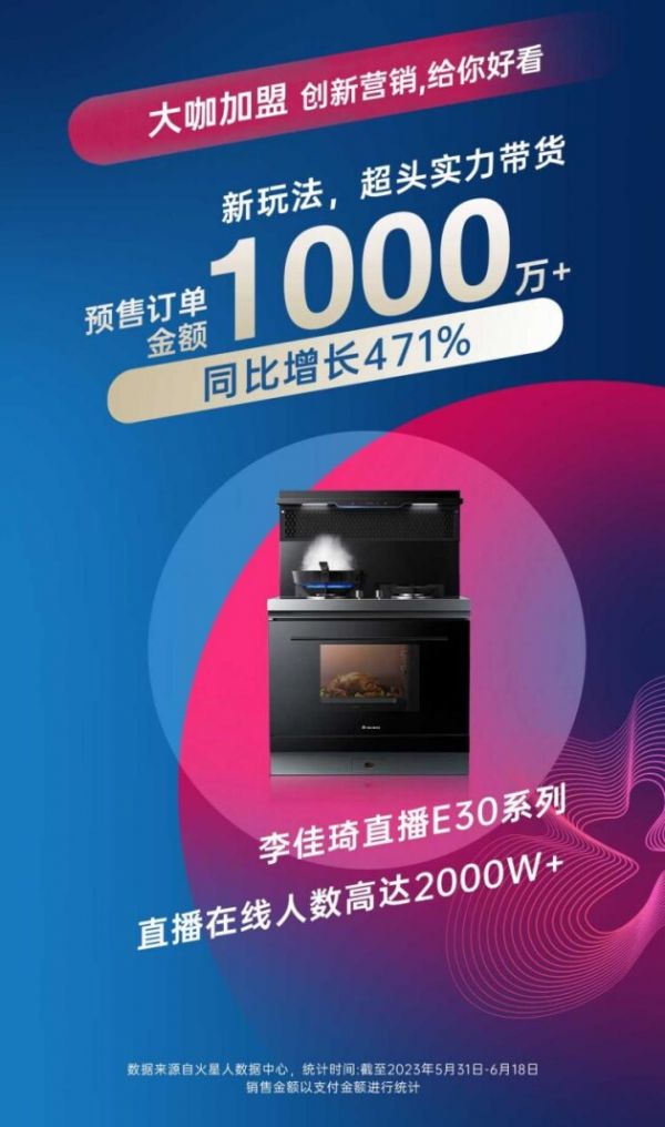 火星人产品通过各种黑科技的应用,无限贴近Z世代生活习惯,深受年轻人的追捧和喜爱,在618期间表现尤为出色!其中,新品E70蒸烤独立集成灶夺得高端单品13000+价位段首发销售TOP1,此外,11000+产品零售销售额同比增长109%,引领行业高端;集成洗碗机零售同比增长30%;延续去年优异表现,稳坐行业龙头。