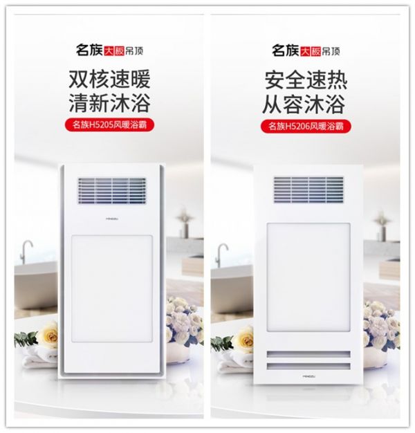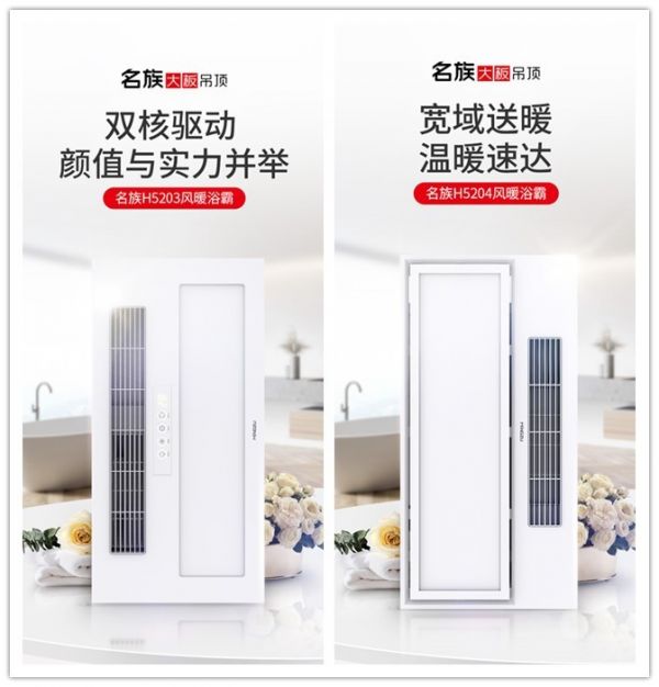名族H52系列新品浴霸简约典雅的外观设计,充满质感,纯净的亚光白搭配任意集成吊顶,带您感受超凡体验。