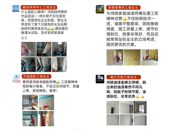 每一个项目工地的高标准落地,每一次高品质交付,不仅来源于鸿扬对工艺细节的严苛要求,也得益于工匠们发自内心的服务意识,“让客户100%满意”作为鸿扬的企业最高目标,早已深深刻进每个鸿扬工匠心里,落到每位工匠的日常行为中。