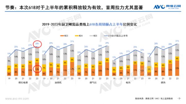 从618三周销额占上半年的比例来看,618的节点效应在逐年增强。尤其是今年,1-5月积累的需求通过促销期释放的效果更加明显,充分体现了厨卫大电的消费复苏相比于快消、旅游等,有一些滞后性。同时也表现出厨卫大电的消费者仍具有一定的价格敏感度。分开三周的占比情况来看,首周“蓄势预热期”的带动力更加显著。